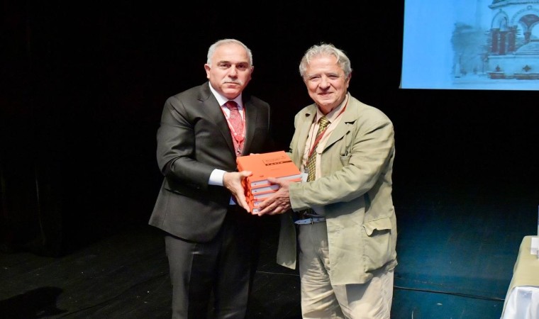 Konuşmaların ardından Fatih Belediye Başkanı M. Ergün Turan, sempozyumun kurul danışmanlarından Prof.Dr. Prof. Dr. Selçuk Mülayim’e hediyelerini verdi.