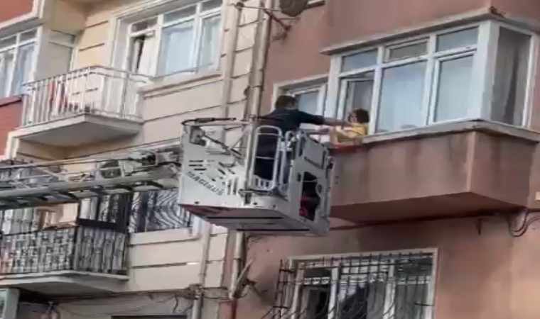 O anlar bir vatandaşlar tarafından cep telefonu kameralarına yansıdı. İtfaiye yardımıyla pencereden alınan çocuk ailesine teslim edildi.