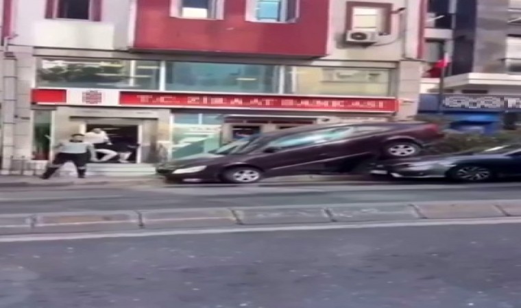 Fatih’te bir sürücü, park halindeki aracını çıkarmak isterken gaza fazla yüklenince arkasındaki park halindeki başka aracın üzerine çıktı. Aracı bulunduğu yerden indirmek isteyen sürücü, az kalsın bir bankanın güvenlik görevlisini eziyordu. O anlar cep telefonu kamerasına yansıdı.