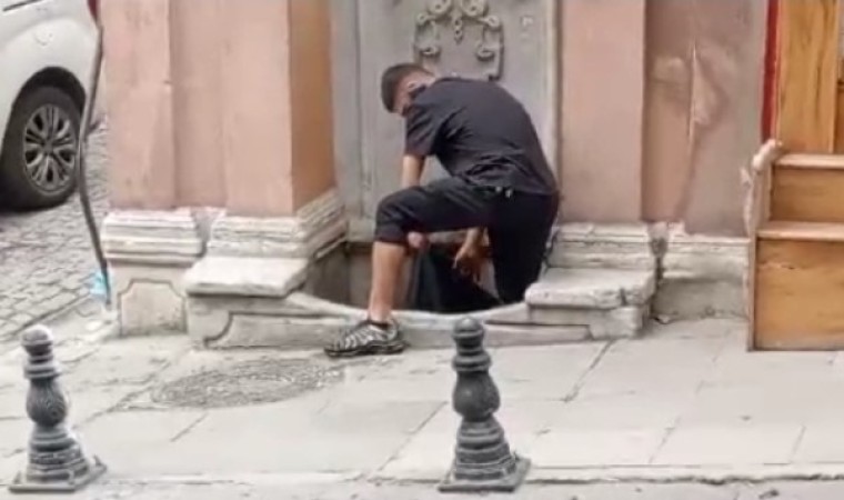 Fatih’te kağıt toplayıcılığı yapan 2 kişi, topladıkları kartonların kantarda ağır gelmesi için çeşmeden kovaya doldurdukları suyu üzerine boşalttı. O anlar cep telefonu kamerasına yansıdı.