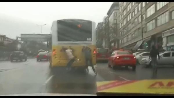 Fatih’te patenlilerin İETT otobüsü arkasında tehlikeli yolculuğu kamerada