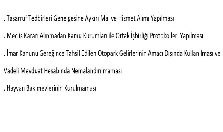 İdare (belediye) tarafından, İmar Kanunu gereğince tahsil edilen otopark gelirlerinin amacı dışında kullanıldığı ve bu gelirlerin vadeli mevduat hesabında nemalandırılmadığının tespit edildiği açıklanan raporda, “Otopark ihtiyacını kendi parselinden karşılamayan yapılara ilişkin, yapı ruhsat harcıyla birlikte tahsil edilen otopark bedellerinin bir kısmının, yönetmelik hükümlerine aykırı bir şekilde amacının dışında kullanıldığı görülmüştür. Yapılan incelemede tahsil edilen otopark ücret gelirlerinin bir kısmının otopark ücret gelirleri hesabında takip edildiği ve otopark hesabında toplanan tutardan muhtelif tarihlerde vergi, resim, harç ve maaş hesabına virman yapıldığı, diğer kısmının ise doğrudan vergi, resim, harç ve maaş hesabında takip edildiği tespit edilmiştir. Kamu idaresi(belediye) tarafından otopark ücret gelirleri hesabında olması gereken 7 milyon 598 bin 854 TL’lik tutarın bölge otoparkı inşasında kullanılmak üzere otopark ücret gelirleri hesabında takip edilmesi gerekirken, doğrudan veya virman yoluyla vergi, resim, harç ve maaş hesabına alınıp buradan harcandığı ve bu suretle amaç dışı kullanıldığı tespit edilmiştir” denildi.