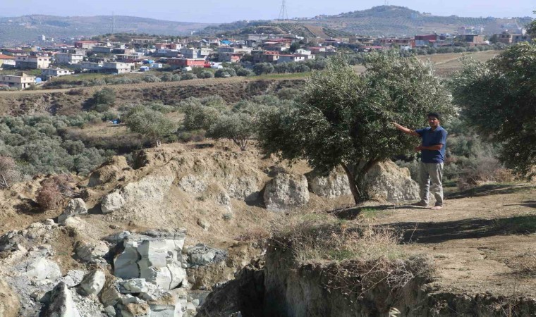 Yarık ortasında kalan onlarca ağacın heba olduğunu dile getiren İbrahim Elmacıoğlu, “Hatay Altınözü’nde, Tepehan Mahallesi’nde ikamet ediyoruz. Buraya zeytin toplamaya geldik. Deprem böyle bir yarık oluşturdu burada. Hala korkuyoruz, şu an zeytin topladığımız esnada bile korku içerisindeyiz. Yine artçı depremler devam ediyor. Gördüğünüz gibi birçok ağacımız telef oldu, tarlamızın alt tarafına gitmekte güçlük çekiyoruz. Araçlar, traktörler gidemiyor o tarafa. Mecburen elimizle gidip toplayıp getiriyoruz. Yani bizim için ağaçlardan zeytin toplamak çok zor. Dün de yine topladığımız esnada bir artçı deprem oldu, ufak tefek hissettik. Yine çocuklarımız ve ailemiz korkuyoruz yani. Bu yıl hasat geçen yıla göre daha iyi. Ama hasadımız iyi olmasına rağmen ağaçlarımız telef oldu” ifadelerini kullandı.