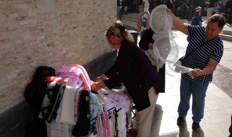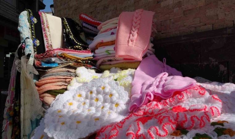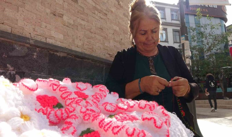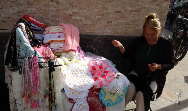 Eşinin vefatının ardından 30 yıl boyunca bu ürünleri yaptığını söyleyen Saniye Dursun, “Burada çeyiz ve hediyelik ürünler yapıyorum. Bunları satarak evin geçimini sağlıyorum. Bu işe eşim 30 yıl önce rahmetli olunca başladım. Bu işimle çocuklarımı büyüttüm, 3 kızımı evlendirdim. Ben de bu şekilde ürünler yaparak kendimi geçindiriyorum. Genellikle iğne oyaları, çember, havlu, çeyizlik ürünler, örtü çeşitleri gibi el emeği ürünler var. Bunları sokakta yapıyorum, sokakta satıyorum. 10 yıldır aynı yerde satış yapıyorum. Belediyemiz sağ olsun burası için bize izin verdi. Farklı bir maaş ve sigortam olmadığı için bununla geçimimi sağlıyorum” dedi.