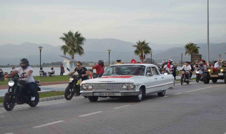 Fethiye’de her yıl düzenlenen Cumhuriyet Konvoyu’nun bu yıl 100. Yıl kutlamaları için düzenlendi. Fethiye Kaymakamlığı tarafından desteklenen konvoy renkli görüntülere sahne oldu. Fethiye’deki diğer marka otomobil kulüpleri, motosiklet grupları ve ticari araçların da yer aldığı konvoy Çiftlik Mahallesi’nden başladı. Katılımcılar arabalarına Türk Bayrakları asarak, bayrak temalı tişörtler giydiler. Konvoy motosikletli trafik ekipleri eşliğinde Sahil yolu boyunca devam etti. Konvoyda tırlar ve römorklu traktörler büyük ilgi çekti. Şehir merkezine geçen konvoyu vatandaşlar selamlarken, cep telefonları ile de görüntüledi.