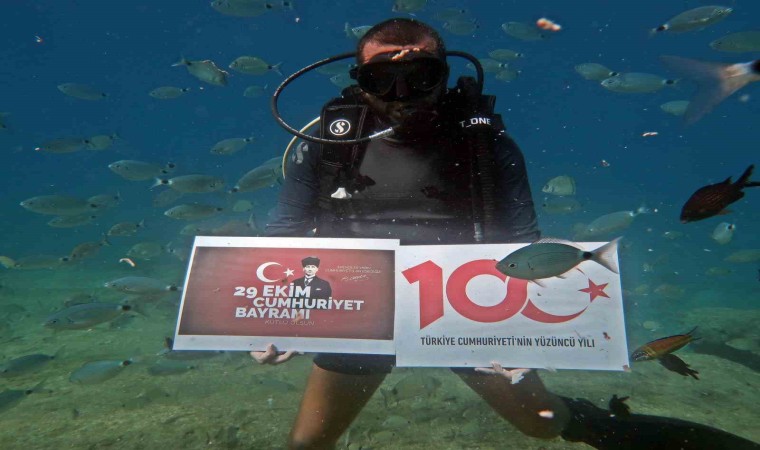 Fethiye’de dalgıçlar, 29 Ekim Cumhuriyet Bayramı’nın 100. yılını deniz dibinde Türk bayrağı açarak kutladı. Bir dalgıç okulundaki dalgıçlar ve misafirler, 10 metre derinlikte Türk bayrakları eşliğinde, "Türkiye Cumhuriyeti’nin 100. Yılı" ve "29 Ekim Cumhuriyet Bayramı" yazılı afişi açtılar. Denizin dibinde açılan bayraklarla yüzen balıklar da güzel görüntüler oluşturdu.