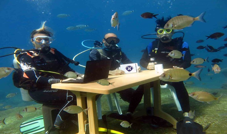 Fethiye’de bir dalış okulunun işletmeciliğini yapan Önder Diktaş ile beraberindeki Aydın Tanal ve Melisa Harless, Dalyan Koyu açıklarında 5 metre derinliğe dalış gerçekleştirdi. Gerçekleştirdikleri dalışta dikkat çeken bir etkinlik gerçekleştiren dalgıçlar, su altında kurdukları masanın etrafında oturarak, turizm sezonu değerlendirme toplantısı gerçekleştirdi. Dalgıçların bu anları ise su altı kamerasıyla kaydedildi. Bir dalgıç diğerinin sorularını cevaplandırırken, diğer dalgıç da bilgisayara notlarını aldı. Dalış Eğitmeni Önder Diktaş, yaptıkları bu etkinlikle Turizm Haftasını kutladıklarını belirterek, "Sezon boyunca yerli ve yabancı tüm misafirlerimizi dalış için bekliyoruz. Bu sezonda farklı etkinliklere imza atmayı planlıyoruz. Amacımız, dalışı Türkiye’de tanıtmak ve sevdirmek" dedi.