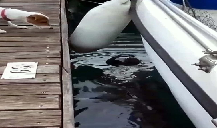 Fethiye'de vatandaşlar, marinada, nesli tükenme tehlikesinde olan bir tür olan Akdeniz foku olduğunu fark etti. Vatandaşlar o anları cep telefonu kamerasıyla kayda aldı. Görüntülerde, iskele etrafından dolaşan bir köpek de foku gözlerini ayırmadan uzunca bir süre izledi. Fok, daha sonra uzaklaşarak, gözden kayboldu. (DHA)