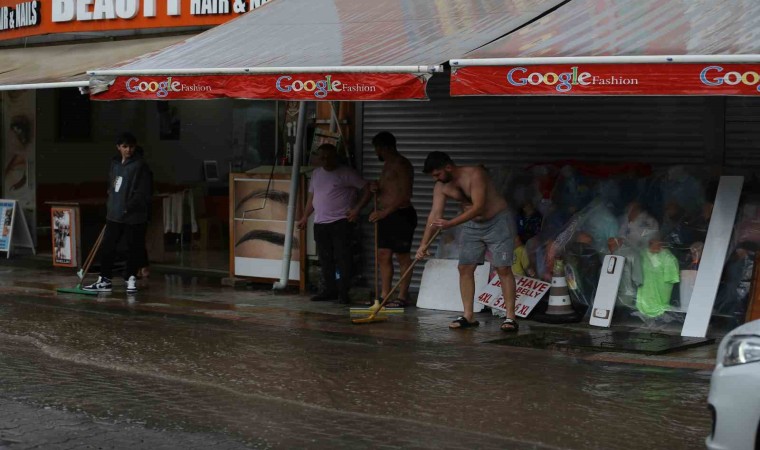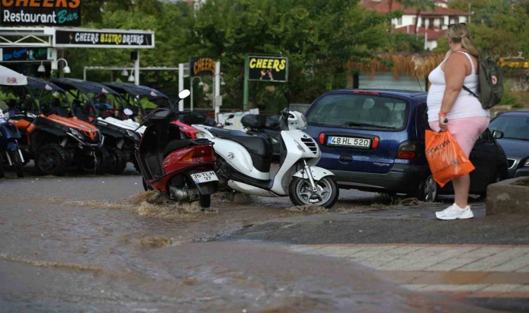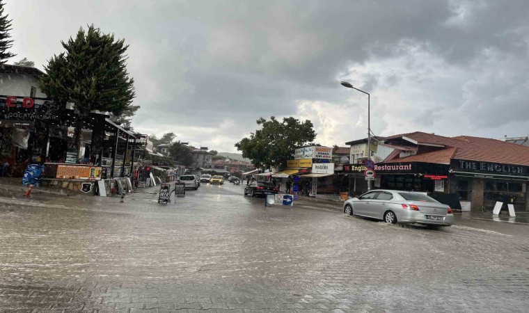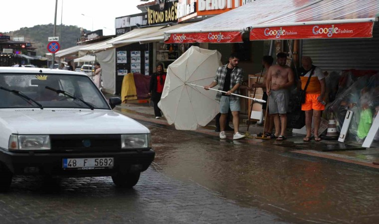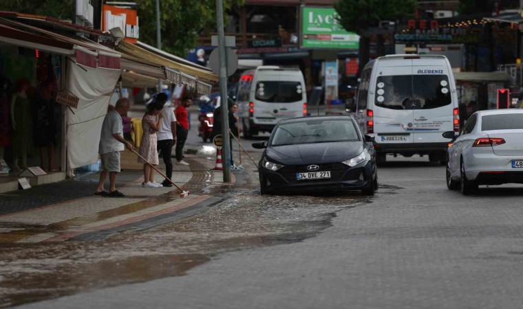 Muğla’nın Fethiye ilçesinin ünlü Ölüdeniz Mahallesi’nde kısa süreli etkili olan sağanak, esnafa ve turistlere zor anlar yaşattı.