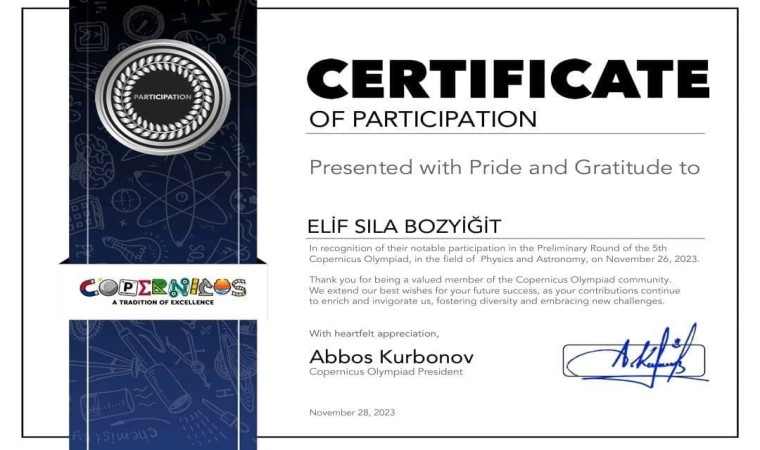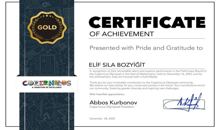 Daha öncede yazdığı 2 kitap ile Türkiye’nin en genç yazarlarından biri olma unvanını alan 6. Sınıf öğrencisi Elif Sıla Bozyiğit bu sefer de adını matematik dalında Dünya’ya duyurdu. Her yıl ABD’de 5 dalda düzenlenen Amerika Copernicus Olimpiyatları’na katılan Elif Sıla Bozyiğit bu yarışmada da matematik dalında altın madalya kazanarak olimpiyat birincisi oldu.