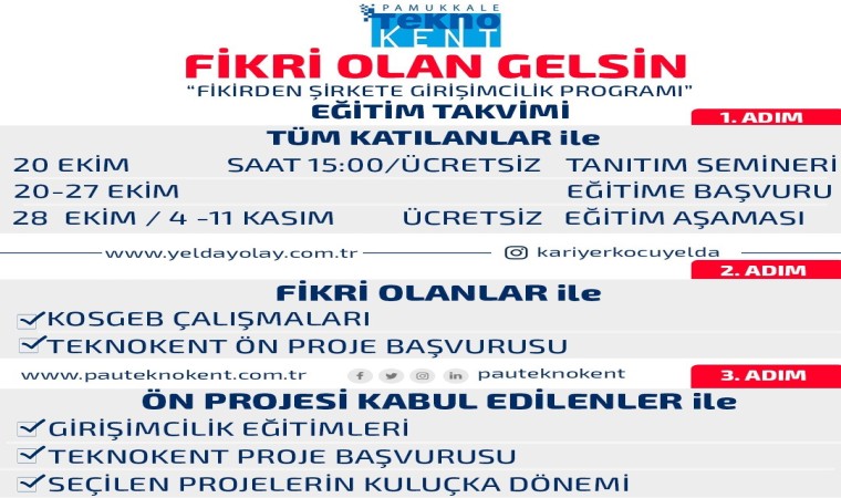 Uçtan uca, fikirden şirketleşmeye kadar girişimcilere; motivasyon, girişimcilik eğitimleri ve destek programlarının tanıtımı sağlanacak. Eğitimlere tam katılımın zorunlu olduğu program sonunda katılımcılara sertifika verilerek şirketleşme süreçlerine destek sağlanacak. Ayrıca, başarılı girişimcilik öyküsü olan kişiler ile girişimci adayları buluşturularak fikir paylaşımı yapılması sağlanacak. Pamukkale Teknokent tarafından ‘Fikri Olan Gelsin’ eğitim programı, Kariyer Koçu Yelda Yolay’ın anlatımı ile 28 Ekim Perşembe günü başlayacak. İlki 28 Ekim 2023’te, ikincisi 4 Kasım 2023’te ve son olarak 11 Kasım 2023’te tamamlanacak eğitim programı 13.00-17.00 saatleri arasında Pamukkale Teknokent konferans salonunda gerçekleştirilecek. Ayrıca bütün vatandaşlar da düzenlenen eğitim programından ücretsiz bir şekilde yararlanabilecek.