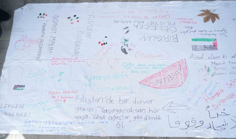 Etkinliğe katılanlar yazdıkları mesajlarla Filistin’e olan desteklerini ve İsrail’in saldırılarına karşı tepkilerini dile getirdiler.