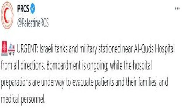 Filistin Kızılayı’ndan yapılan açıklamada, “İsrail tankları ve askerleri her yönden Al Quds hastanesi yakınına konuşlandı. Bombardıman devam ederken; hastanede hastaların, ailelerinin ve sağlık personelinin tahliyesi için hazırlıklar sürüyor” denildi.