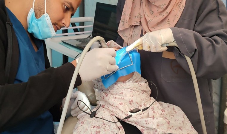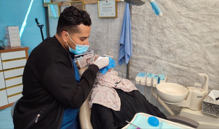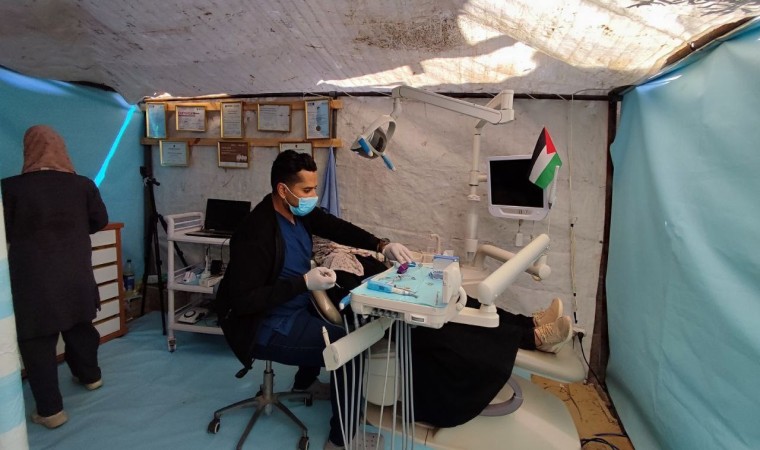 Gazze Şeridi’nde İsrail saldırısı sonucu muayenehanesi kullanılamaz hale gelen Filistinli diş hekimi, hastaları çadırda tedavi ediyor.