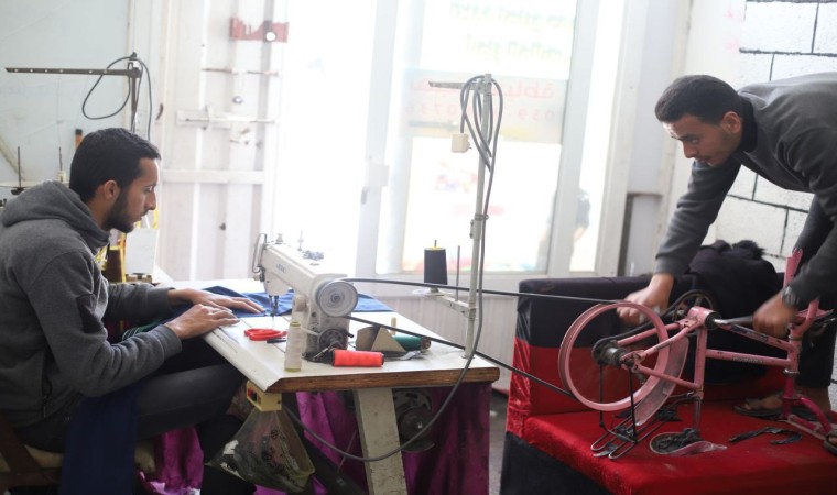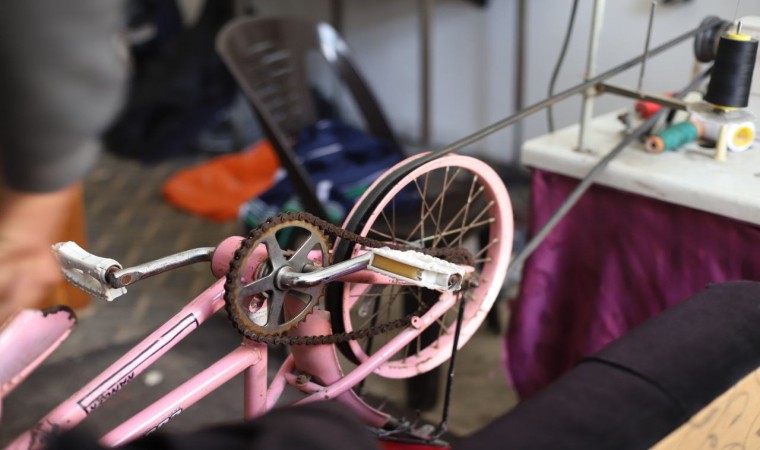 Gazze Şeridi’nde abluka altında hayata tutunmaya çalışan Filistinliler, dikiş makinesi gibi aletleri kendi imkanlarıyla çalıştırıyor.