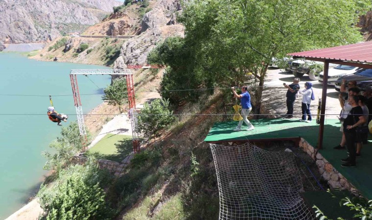 Erzincan’ın gözde ilçesi Kemaliye’de yer alan Karanlık Kanyon’da kurulan zipline, macera severlerin akınına uğradı.