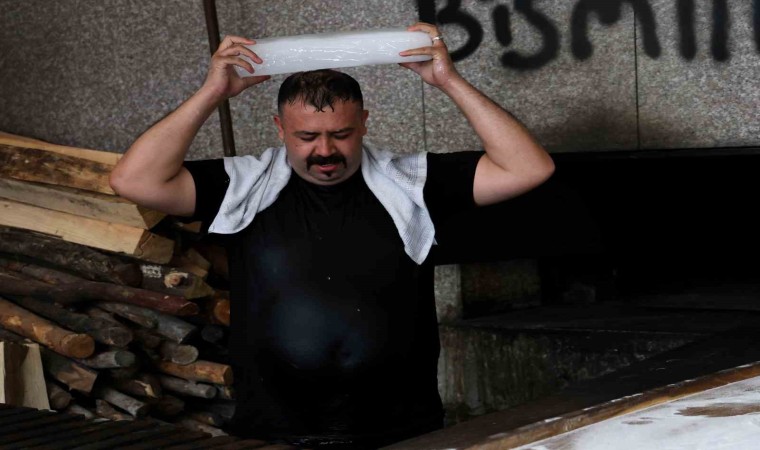 Saat başı ekmek pişiren ustalar geri kalan molalarda ise buz küpleriyle soğuttukları suyu kafalarından aşağı dökerek serinliyor. Bazı anlarda ise ustalar buz küplerine sarılıp serinlemeye çalışıyor.