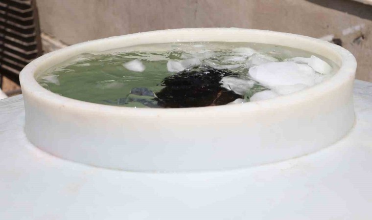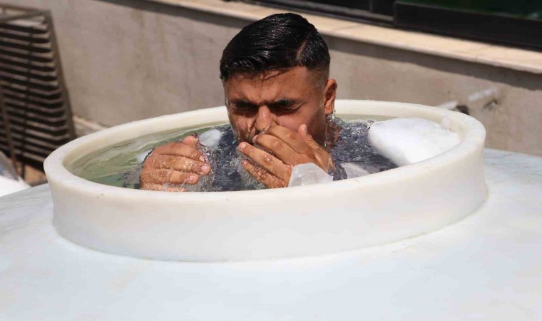 Adana’da 250 derecelik fırında çalışan işçiler, sıcaktan bunalınca 2 tonluk buzlu varile girip serinliyor.