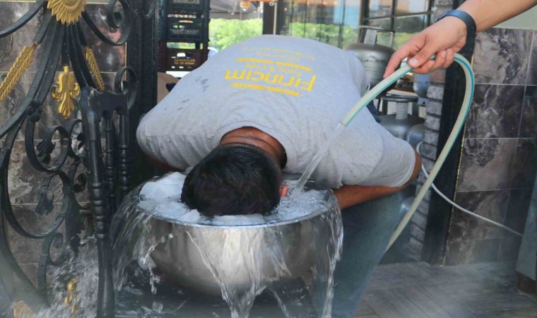 Yazın bol bol soğuk içecek tükettiklerini kaydeden ustalar, serinlemek için ise kafalarını buzlu suya sokup hortumla serinlemeye çalışıyor.