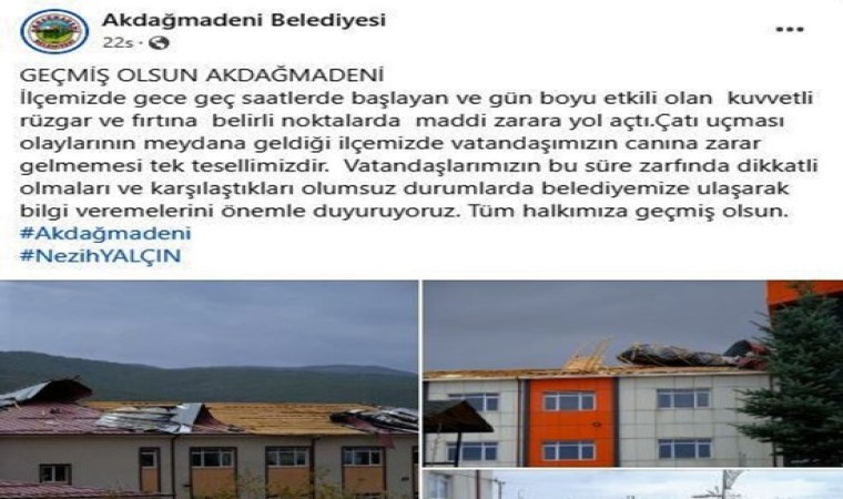 Yozgat’ın Akdağmadeni ilçesinde dün meydana gelen fırtına sonrası hasar tespit çalışmaları başladı. Akdağmadeni Belediye Başkanı Nezih Yalçın, sosyal medya hesabından yaptığı paylaşımla vatandaşlara geçmiş olsun dileklerini iletirken, karşılaşabilecekleri bir olumsuzlukta belediye ekiplerine haber vermelerini istedi.