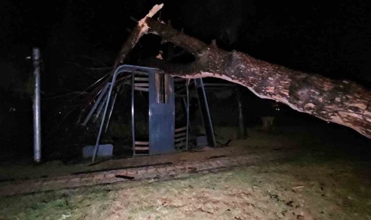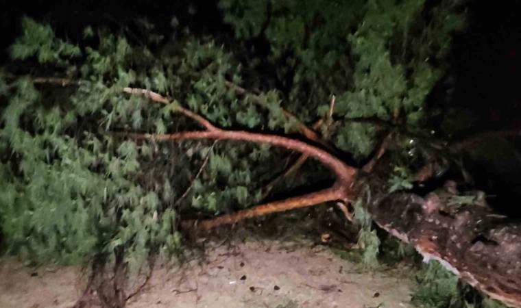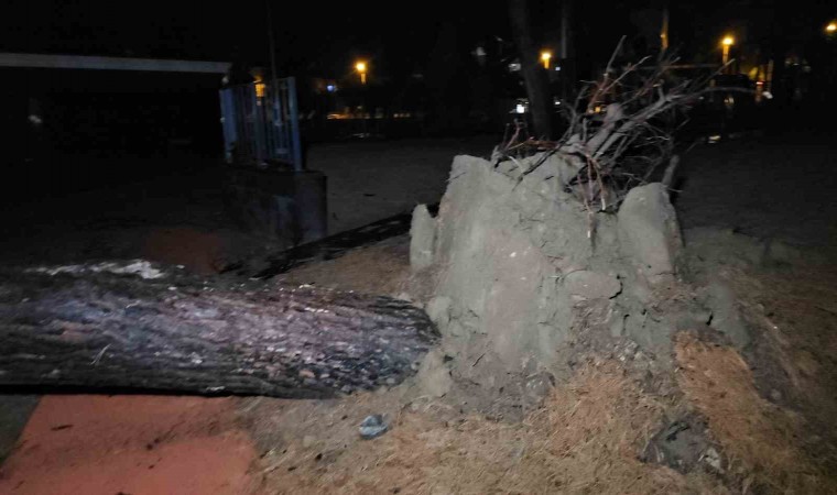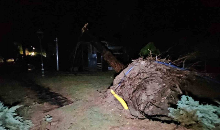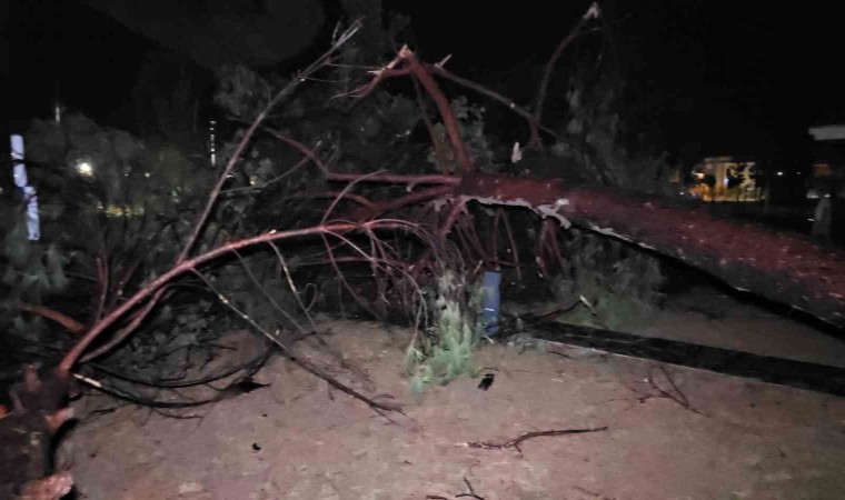 Aydın’ın Nazilli ilçesinde akşam saatlerinde etkili olan sağanak, dolu yağışı ve fırtına, Nazilli Millet Bahçesi’ndeki asırlık 6 çam ağacını devirdi. Ağaçlarla beraber yuvaları da yıkılan kuşlar ise şaşkın bakışlarla ekipleri izledi.