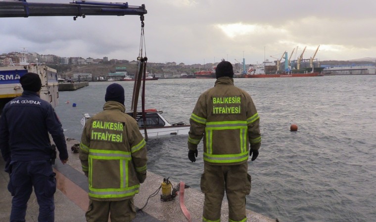 Balıkesir’in Bandırma ilçesinde şiddetli fırtınada batan tekne vinç yardımıyla denizden çıkarıldı.