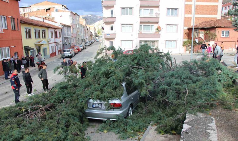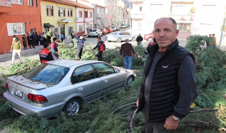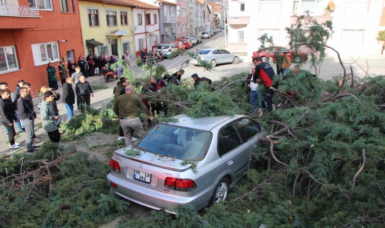 oldu. Beyazıtpaşa Mahallesinde fırtınaya dayanamayan büyük gövdeli çam ağacı bir otomobilin üstüne devrildi. Bir anda neye uğradıklarını şaşıran sürücü Muharrem Tilki, Efe Çelik ve Birkan İsmail Öksüz dalların sardığı aracın içinde mahsur kaldı.