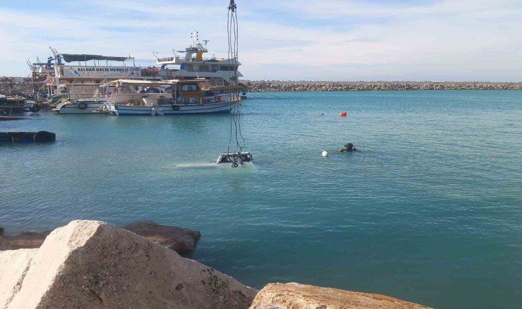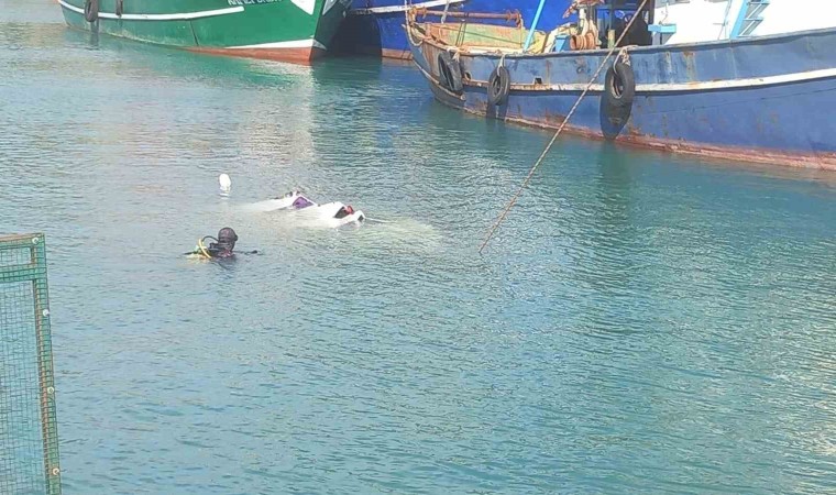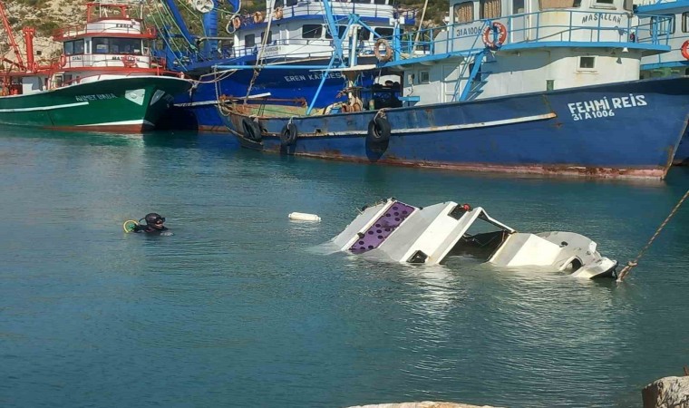 Hatay’ın Samandağ ilçesinde etkili olan fırtınayla Akdeniz’in sularına gömülen balıkçı teknesi, dalgıç ekiplerinin çalışmasıyla vinçle karaya çıkarıldı.