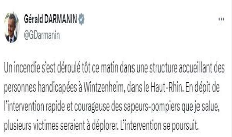 Fransa’nın Wintzenheim ilçesinde engelli bakımevinde yangın çıktı. Fransa İçişleri Bakanı Darmanin, yangına müdahalenin sürdüğünü ifade ederek, “Bu sabah erken saatlerde Haut-Rhin, Wintzenheim'da engelli bakımevinde yangın çıktı. İtfaiyenin hızlı ve cesur müdahalesine rağmen çok sayıda can kaybı olduğu bildirilmiştir. Müdahale devam etmektedir” dedi.