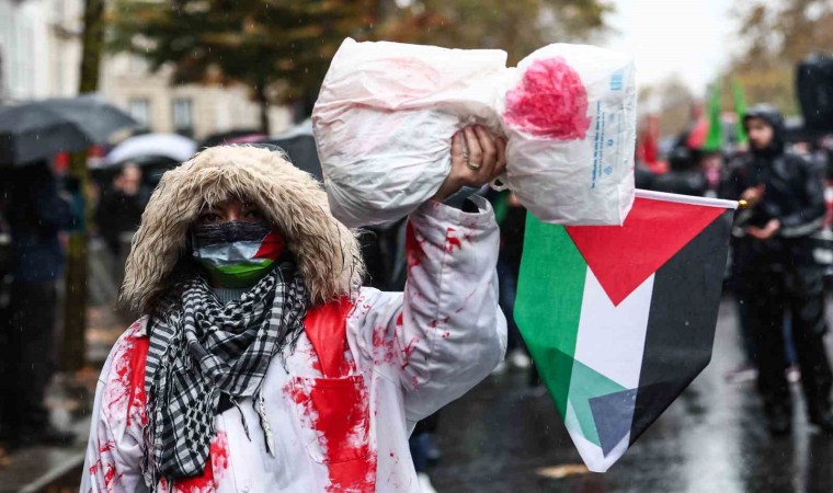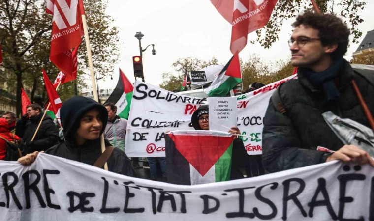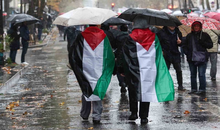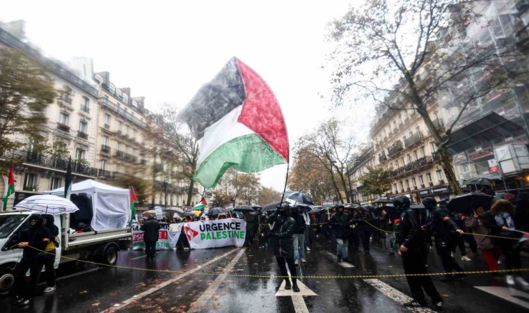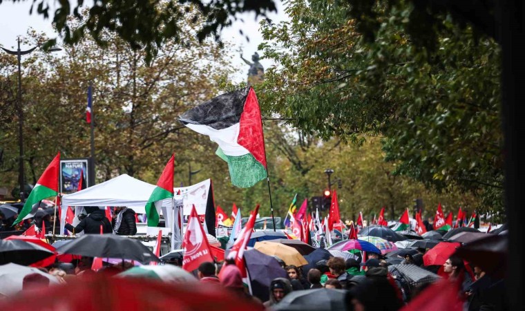 Fransa’nın başkenti Paris’te yaklaşık 60 bin kişi sağanak yağışa rağmen Filistin’e destek için yürüdü.
