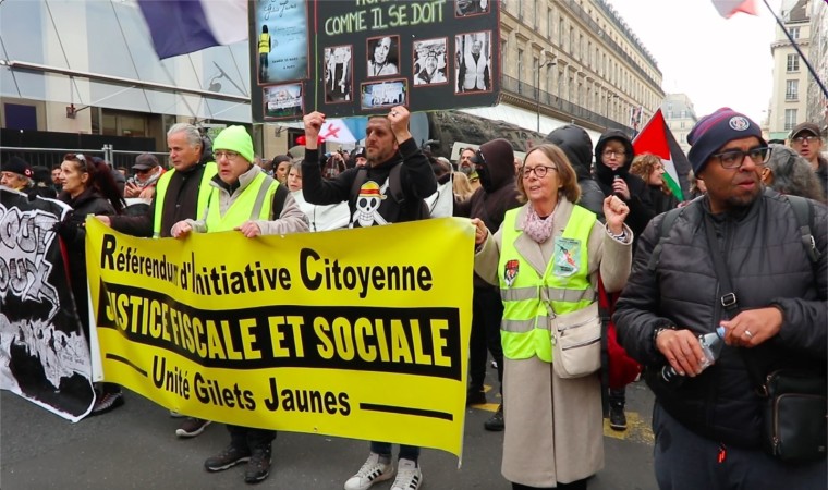 Fransa’da 17 Kasım 2018’de başlayan Sarı Yelekliler Hareketi 6. yıldönümü dolayısıyla yürüyüş düzenledi. Köylülerin kullandığı mazot için yapılan akaryakıt zammına karşı başlatılan ve ülke geneline yayılan Sarı Yelekliler Hareketi’nin Paris’teki yürüyüşünde önceki yıllara göre katılımın düştüğü görülse de yüzlerce kişi Louvre Müzesi’nde bir araya geldi. Pigalle’e doğru yürüye göstericiler, “Her zaman ayaktayız asla diz çökmeyeceğiz”, “Vatandaş girişimi referandumu”, “Sarı Yelekliler Birliği” pankartları taşırken, “Macron istifa”, “Sarı Yelekliler Meydanlarda" gibi sloganlar attı.