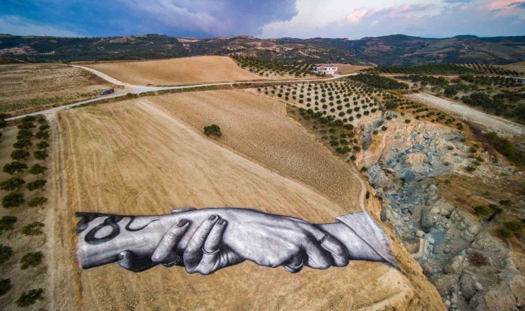 Asrın felaketinin yerle bir ettiği Hatay’da ünlü Fransız Arazi Sanatçısı Saype, dünyaya birlik ve beraberlik mesajı vermek amacıyla Defne ilçesi Armutlu Mahallesi’nde enkaz üzerine 700 metrekare alanda dev eser çizmişti. Sanatçı aynı kardeşlik eserini kömür ve tebeşirle bu kez de depremde devasa yarık oluşan zeytin bahçesine çizdi. Saype, Samandağ’ın Çubukçu Mahallesi’ndeki 5 dönümlük zeytinlikte devasa yarığın yanına iki elin birbirini tutuğu kardeşlik eserini yaptı. 750 metrekare alanda doğal pigmentlerden oluşan eserin “Hatay’da Duvarların Ötesi” projesi çerçevesinde birlik ve beraberlik için yapıldığı belirtildi.