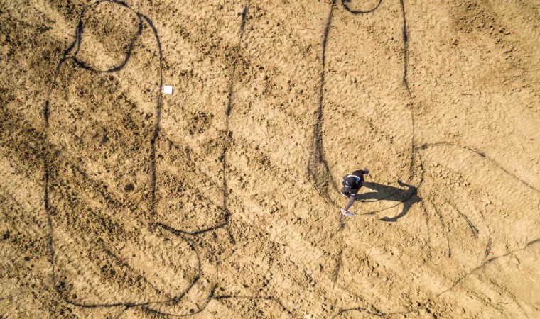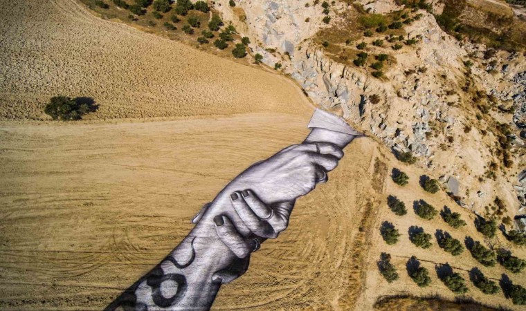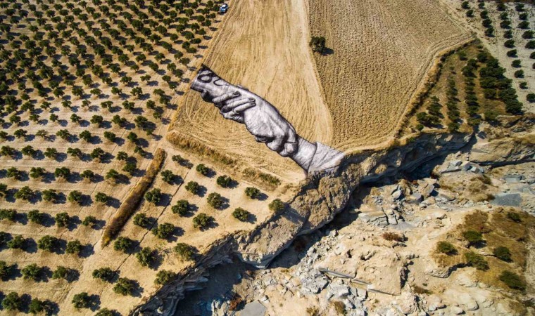 Fransız sanatçı Saype, 6 Şubat depremlerinde Hatay’da ortadan ikiye bölünen zeytin bahçesine kardeşlik eseri yaptı.