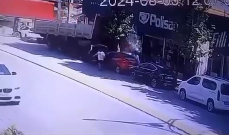 Bir iş yerinin güvenlik kamerasına yansıyan görüntüde, freni boşalan kamyonun otomobillerin üzerine çıktığı, ardından da ağaca çarparak durabildiği görüldü. Aynı zamanda görüntüde, kırmızı otomobilden inen 2 kişinin kazadan kıl payı kurtuldukları ve panikle koştukları anlar da yer aldı.