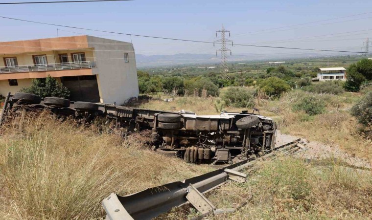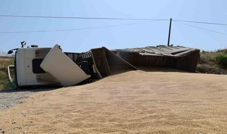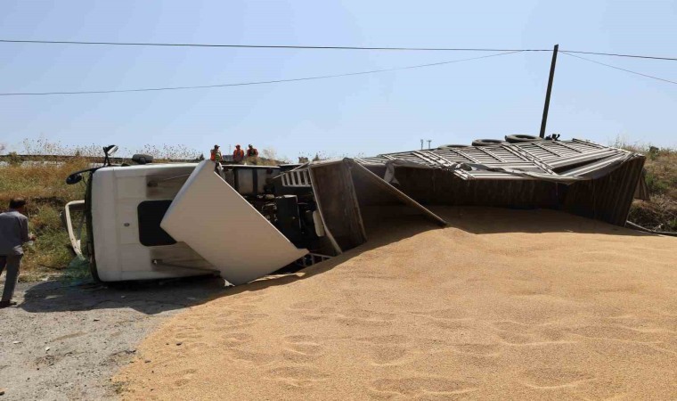 Manisa’nın Turgutlu ilçesinde park halindeyken freni boşalan buğday yüklü tır bir anda hareket ederek devrildi.