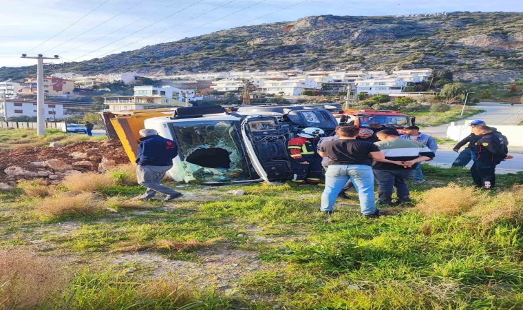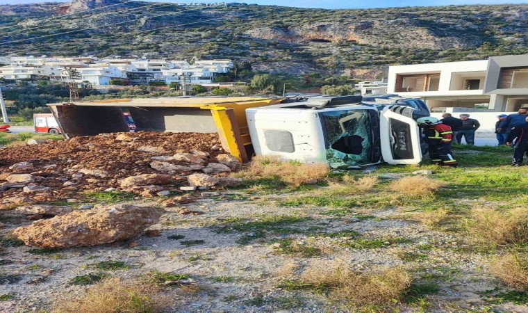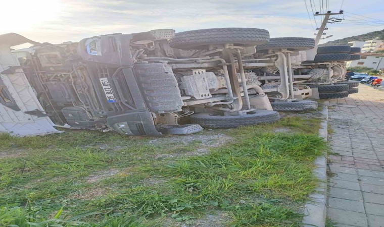 Aydın’ın Kuşadası ilçesi’nde freni patladığı ileri sürülen harfiyat kamyonu devrildi. Kazada yaralı sürücü kendi imkanlarıyla kamyondan çıktı.