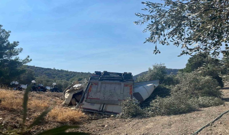 Muğla’nın Datça ilçesinde seyir halinde freni boşalan tır yoldan çıkararak ters dönerken, tır sürücüsü kazadan yara almadan kurtuldu.