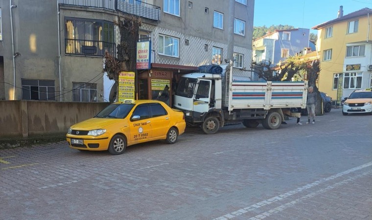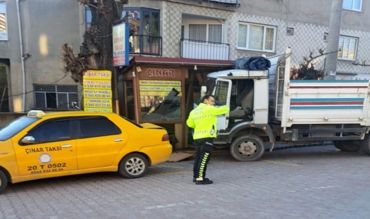 Denizli’de park halinde frenleri boşalan kamyon, taksi durağına girdi.