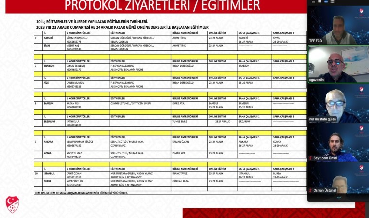 Yoğun eğitim ve uygulama süreci ayın son haftasında da devam edecek ve 23-29 Aralık 2023 tarihlerinde Ankara, İstanbul, Bursa, Konya, Samsun, Kayseri, Sivas, Trabzon, Rize ve Erzurum illerinde çalışmalar gerçekleştirilecek. TFF Futbol Gelişim Direktörü Oğuz Çetin’in yönetiminde illerde açılan eğitim programlarında FGD antrenör eğitim programı antrenör eğitimcileri, Serhat Sütlü’nün koordinasyonunda görev yapıyor.