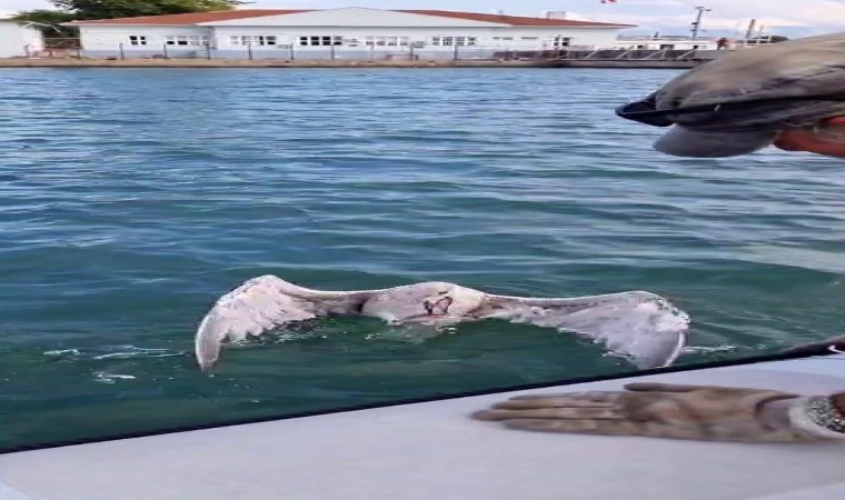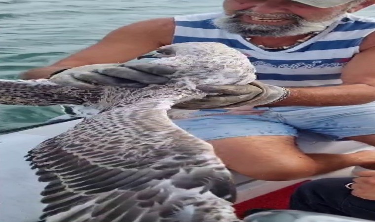 Amatör kamera tarafından kaydedilen görüntülerde kurtarılan martı yeniden denizin üzerinden uçarak uzaklaştı.