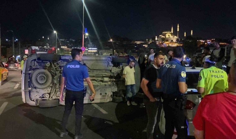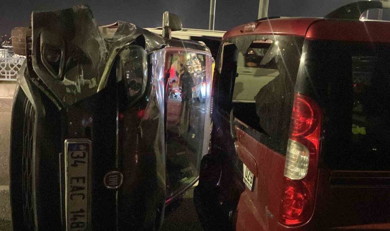 Galata Köprüsü’nde sürücüsünün direksiyon hakimiyetini kaybettiği hafif ticari araç, park halindeki 2 araca çarptı. Yan yatan araçta bulunan 1’i kadın 2 kişi yaralandı.