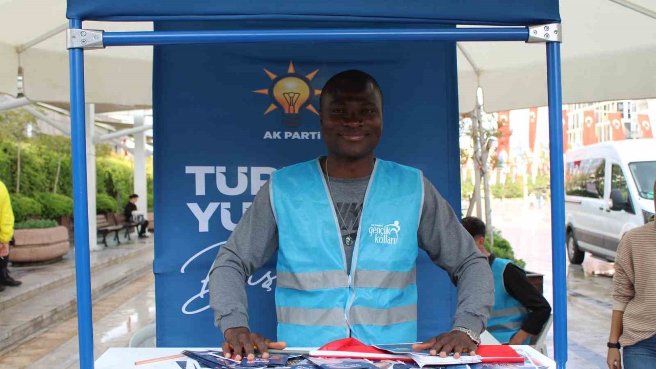 AYDIN’DA AK PARTİ’NİN SEÇİM ÇALIŞMALARINA DESTEK OLAN VE ELİNE ALDIĞI BROŞÜRLERİ DAĞITAN GANA UYRUKLU 28 YAŞINDAKİ ZAKARİYA MUNTARİ, GÖRENLERİ ŞAŞIRTIYOR. CUMHURBAŞKANI ERDOĞAN’A VEFA BORCU OLDUĞUNU BELİRTEN MUNTARİ; “OY KULLANMA HAKKIM YOK ANCAK RECEP TAYYİP ERDOĞAN’A KARŞI BİR VEFA BORCUM VAR” DEDİ.