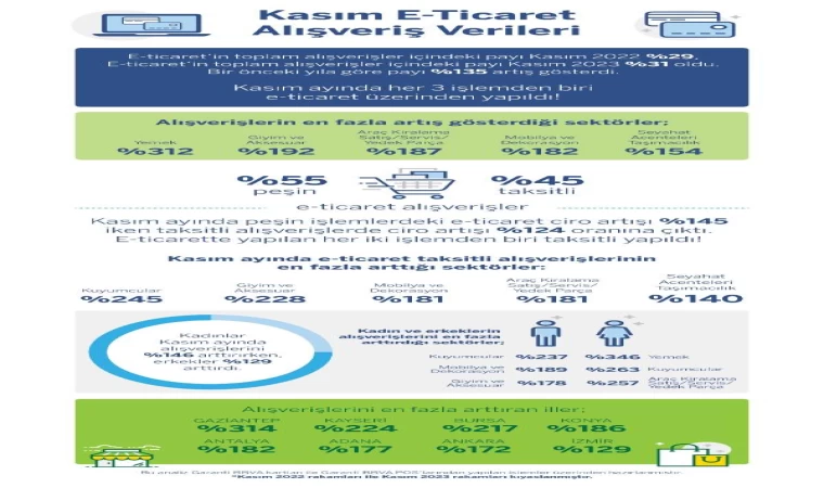 Araştırmaya göre; Kasım ayında peşin e-ticaret alışveriş cirosu yüzde 145 artış gösterirken, taksitli alışverişlerin cirosu da yıllık bazda yüzde 124 arttı. E-ticaret alışverişlerinin yüzde 55’i peşin yüzde 45’i taksitli yapıldı, diğer bir ifadeyle Kasım ayında yaklaşık her iki işlemden biri taksitli biri peşin olarak gerçekleşti.