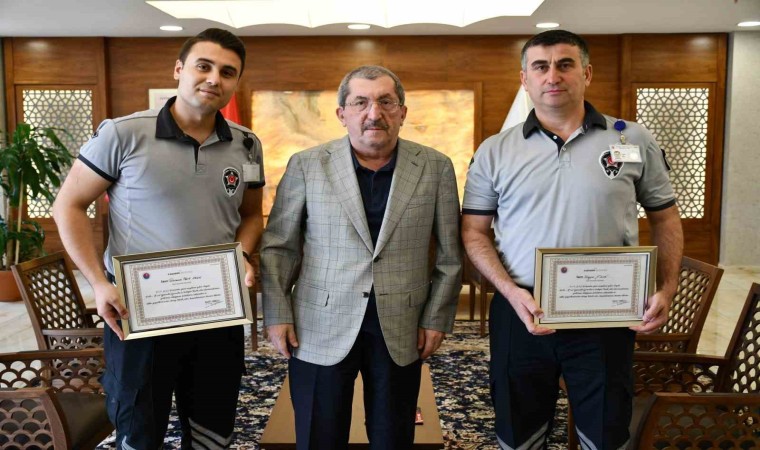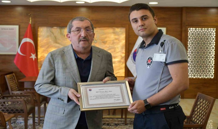 Karabük Belediye Başkanı Rafet Vergili, güvenlik görevlileri Tahsincan Mert Ordu ve Hüseyin Fidan’ı tebrik ederek başarı belgesiyle ödüllendirdi.