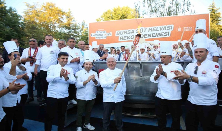 Bursa Büyükşehir Belediyesi tarafından Bursa’nın tescilli lezzetlerini dünyaya duyurmak amacıyla düzenlenen 3. Bursa Uluslararası Gastronomi Festivali’nde, Türkiye’nin farklı kentlerinden gelen 150 civarında şefin katılımıyla ‘Bursa Süt Helvası’ rekor denemesi yapıldı. Dev kazanda hazırlanan 5 ton civarındaki süt helvası, Başkan Mustafa Bozbey tarafından vatandaşlara ikram edildi.