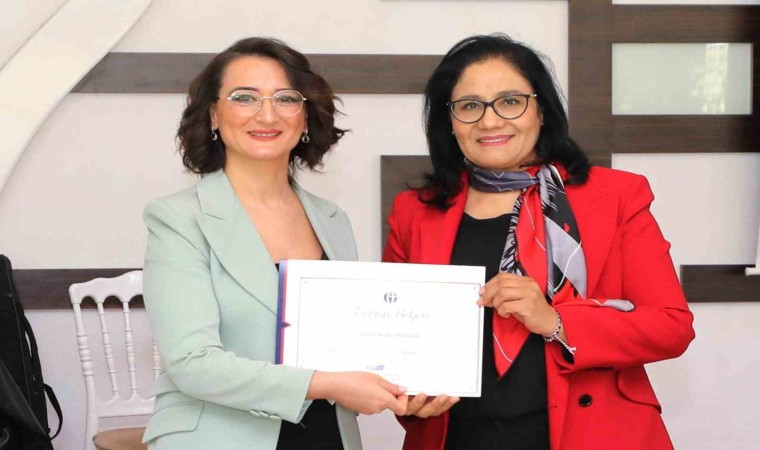 Konuşmalardan sonra GAÜN Rektör Yardımcısı Prof. Dr. Ayşe Balat, Psikolog Seda Ovayolu’ya belge takdim etti.