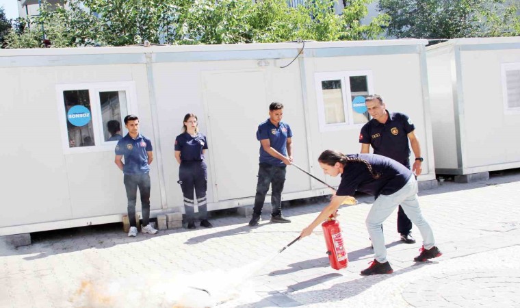 Deprem nedeniyle geçici konteynerlerde yayın hayatlarına devam eden basın mensuplarına, itfaiye tarafından yangın söndürme eğitimi verildi.