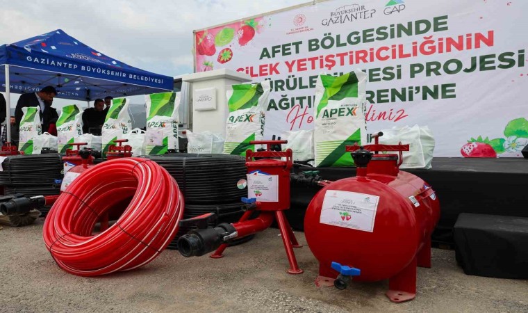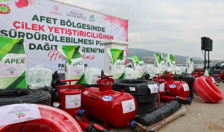 Gaziantep Büyükşehir Belediyesi, depremde ağır hasar alan Nurdağı ve İslahiye’de çilek üretimini sağlamak ve sürdürülebilirlik oluşturmak amacıyla 200 çiftçiye çilek fidesi, gübre, ilaç ve malç temini ile damlama sulama sistemi düzenlenen törenle dağıtıldı.