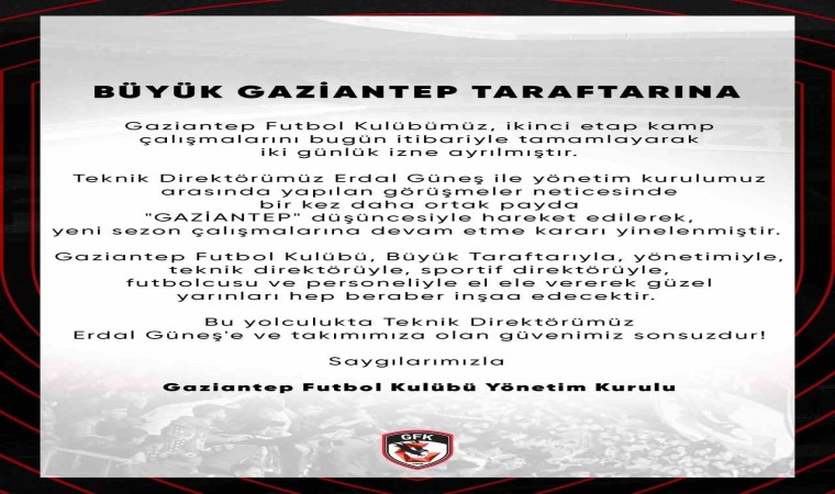 Gaziantep ekibinden konu ile ilgili açıklamada, "Teknik Direktörümüz Erdal Güneş ile yönetim kurulumuz arasında yapılan görüşmeler neticesinde bir kez daha ortak payda Gaziantep düşüncesiyle hareket edilerek yeni sezon çalışmalarına devam etme kararı yinelenmiştir. Gaziantep FK, taraftarıyla, yönetimiyle, teknik direktörüyle, sportif direktörüyle, futbolcusuyla ve personeliyle ele ele vererek güzel yarınları hep beraber inşa edecektir. Bu yolculukta teknik direktörümüz Erdal Güneş ve takımımıza olan güvenimiz sonsuzdur" ifadelerini kullandı.