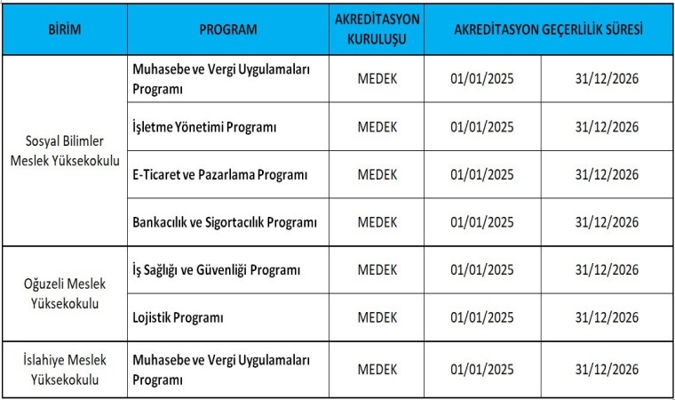 Bu ziyaretin sonucunda; İslahiye Meslek Yüksekokulu Muhasebe ve Vergi Uygulamaları, Oğuzeli Meslek Yüksekokulu İş Sağlığı ve Güvenliği, Lojistik, Sosyal Bilimler Yüksekokulu Muhasebe ve Vergi Uygulamaları, İşletme Yönetimi, E-Ticaret ve Pazarlama ve Bankacılık ve Sigortacılık programları akreditasyon aldı.